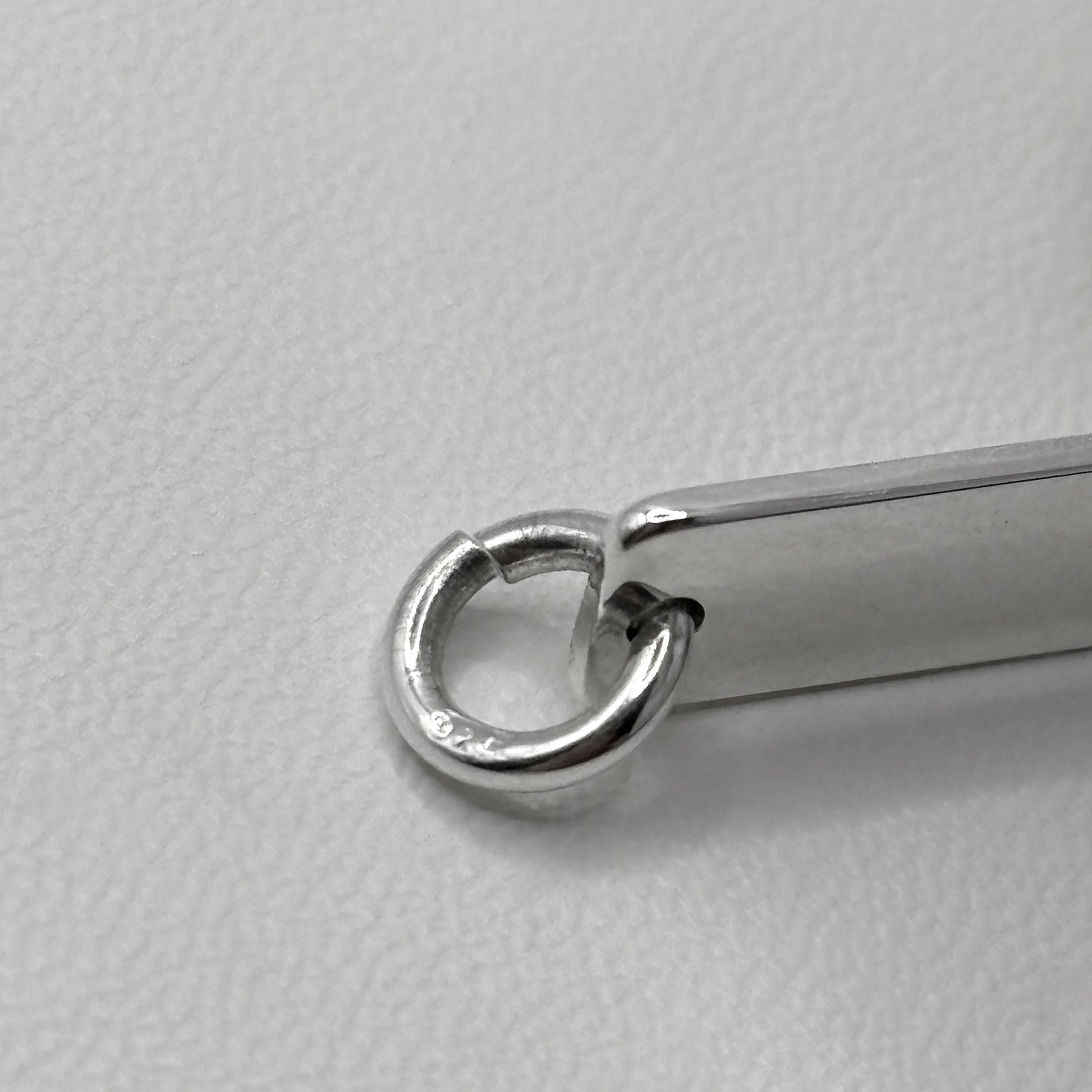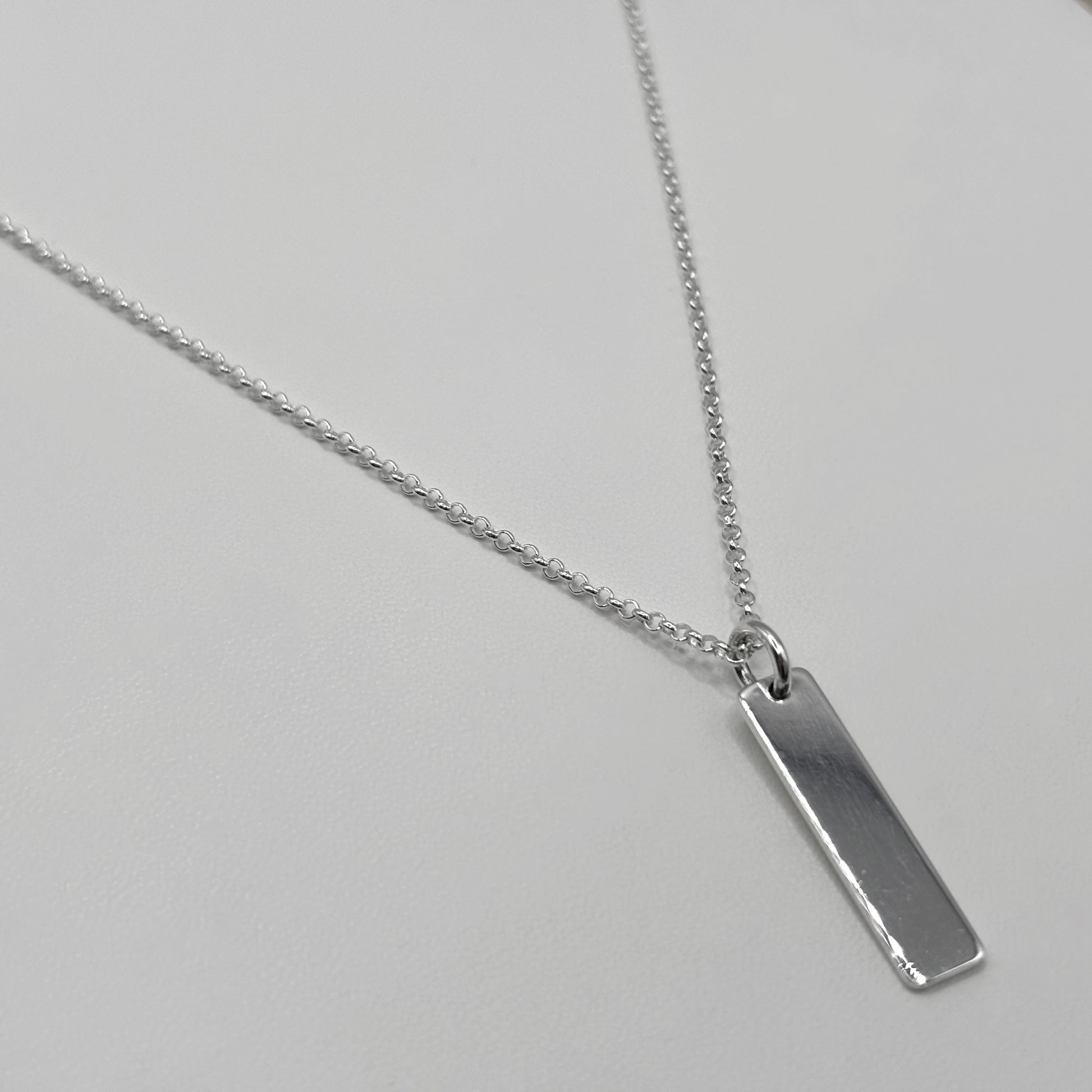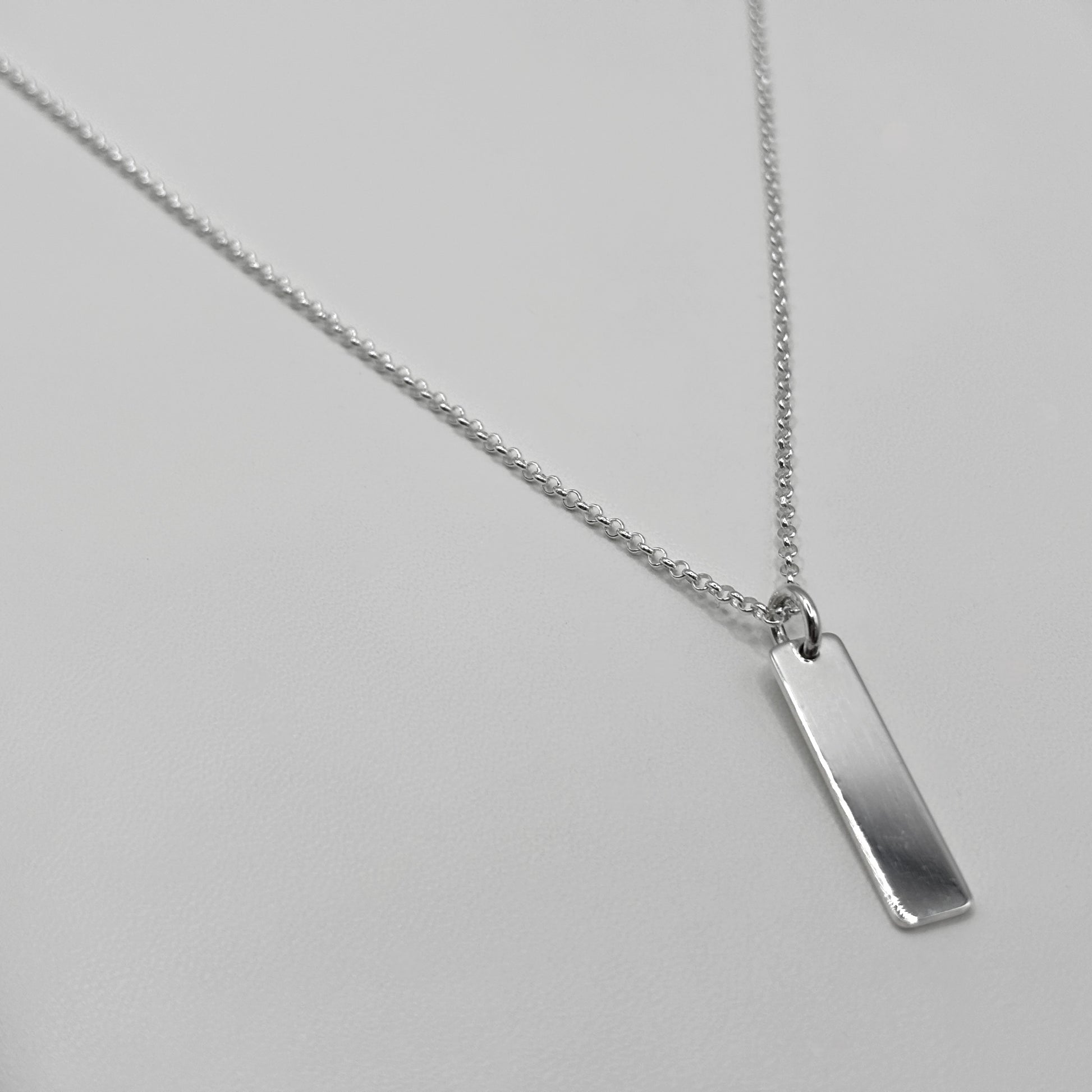 A solid sterling silver bar pendant with high shine on a fine classic chain necklace.