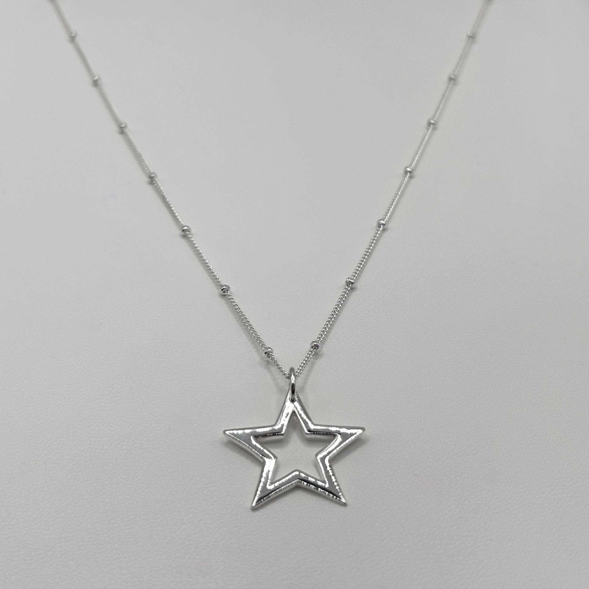 Delicately radiant, this sterling silver satellite chain features dainty silver beads spaced evenly along a slender chain, adding subtle shimmer with every movement. Suspended at its centre is a beautifully minimalist cut-out star pendant, a symbol of hope, guidance and celestial charm. Made from sterling silver, this necklace is both lightweight and durable, perfect for everyday wear or layered with other pieces for a dreamy, curated look.