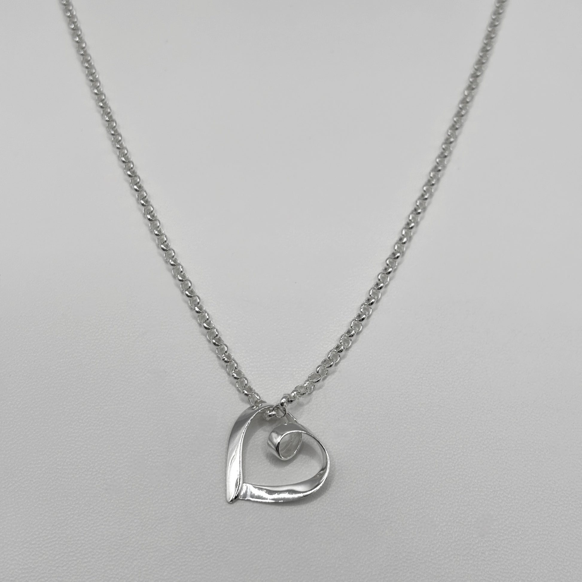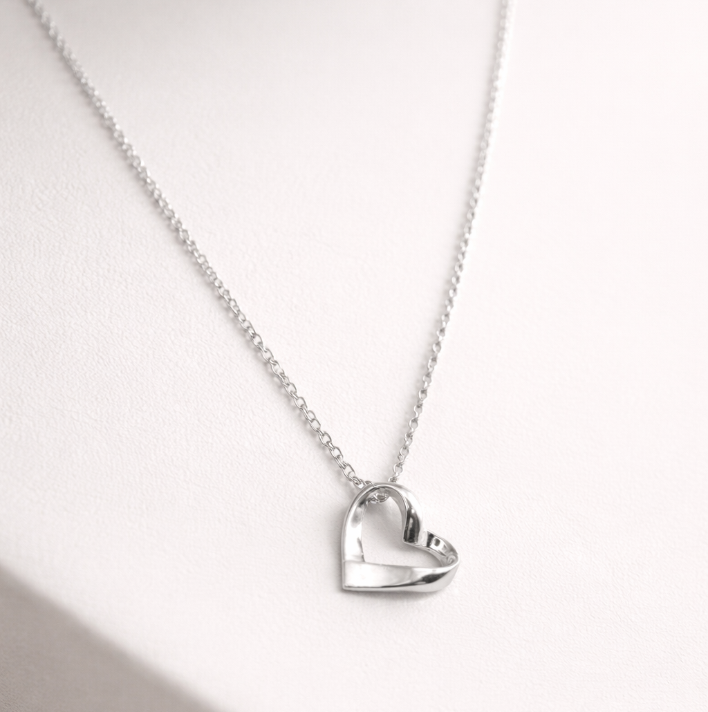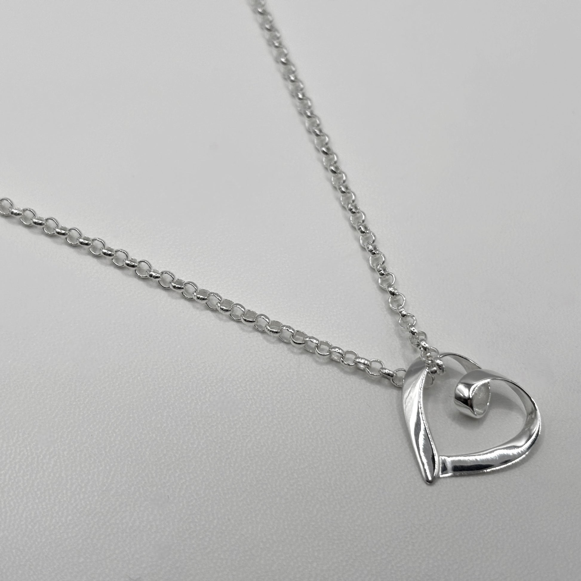 A pretty heart shaped pendant that flows like a ribbon on a classic necklace chain. The ribbon heart hangs beautifully at an angle and catches the light showing it's elegant design. The heart is 17mm by 17mm and the chain is 2.7mm wide with a choice of 16", 18" and 20" lengths. Made from sterling silver and hallmarked.
