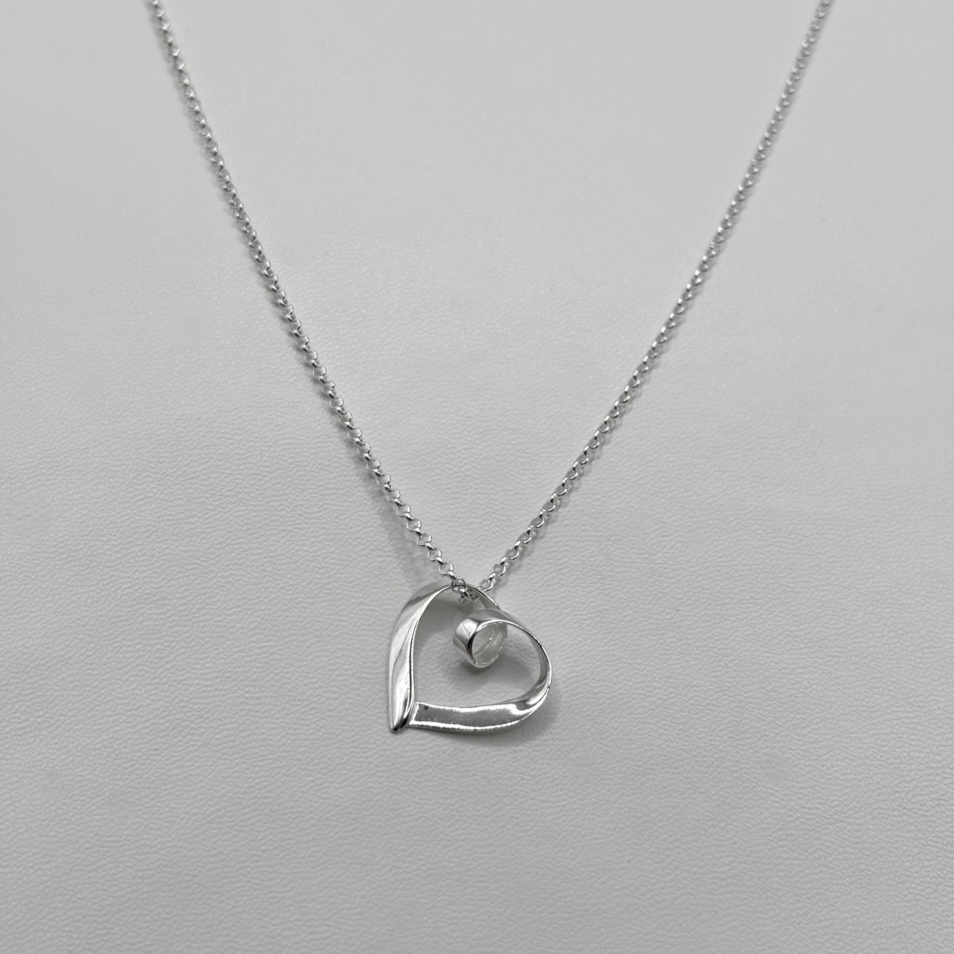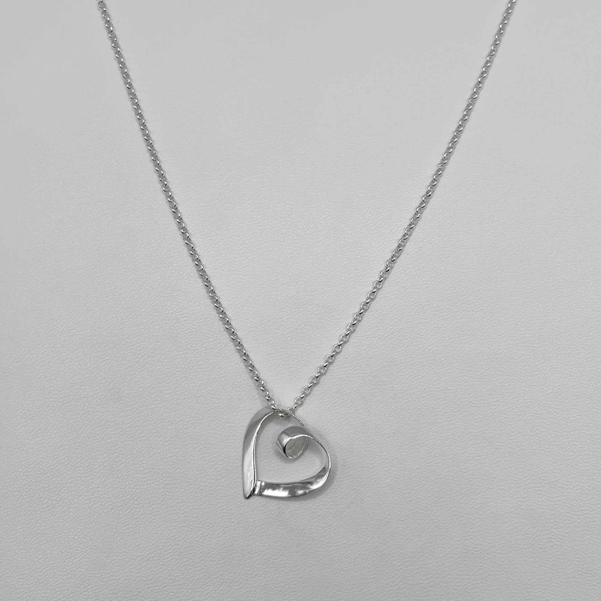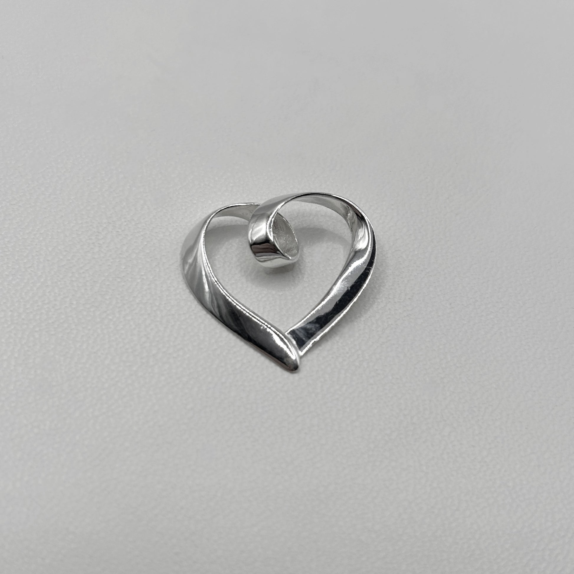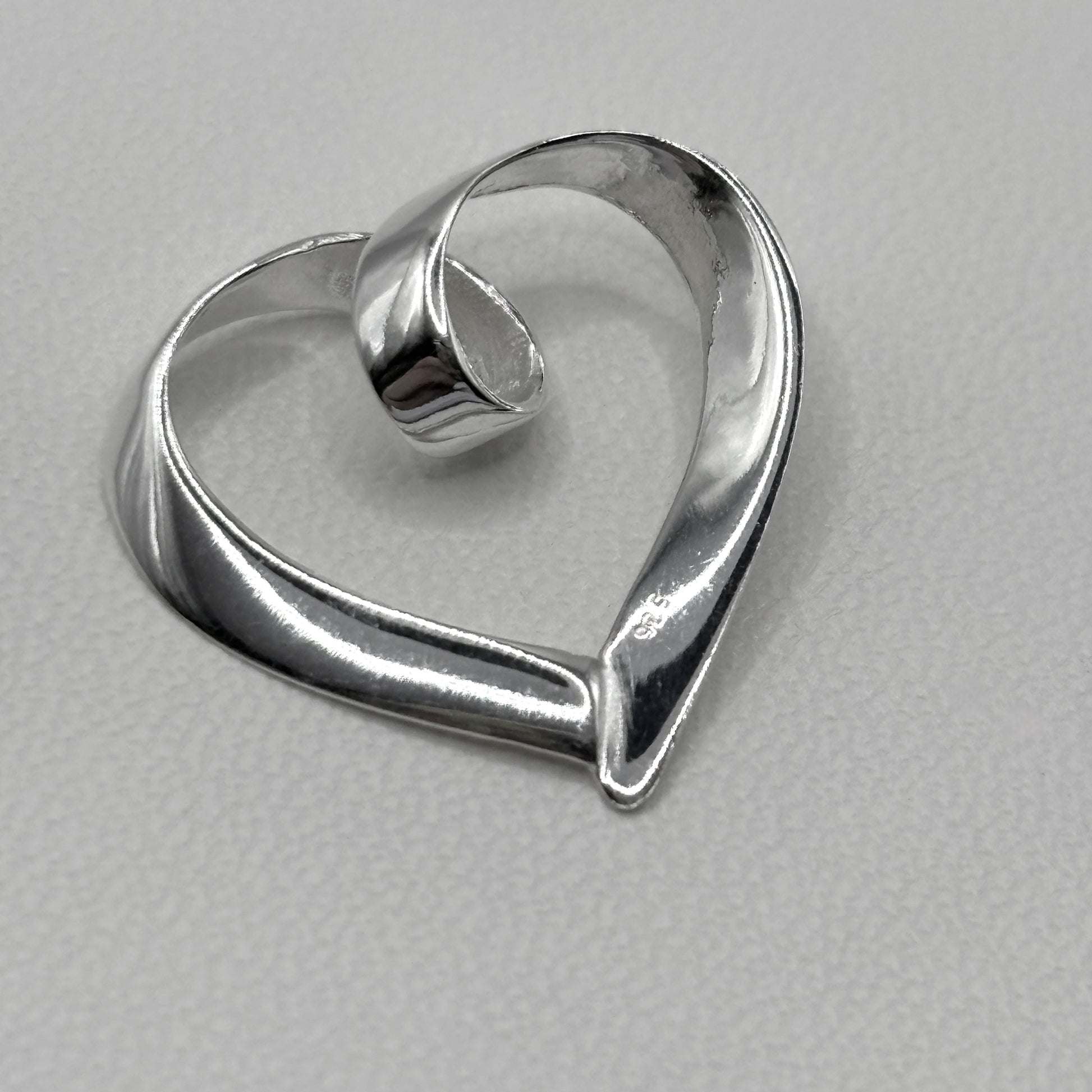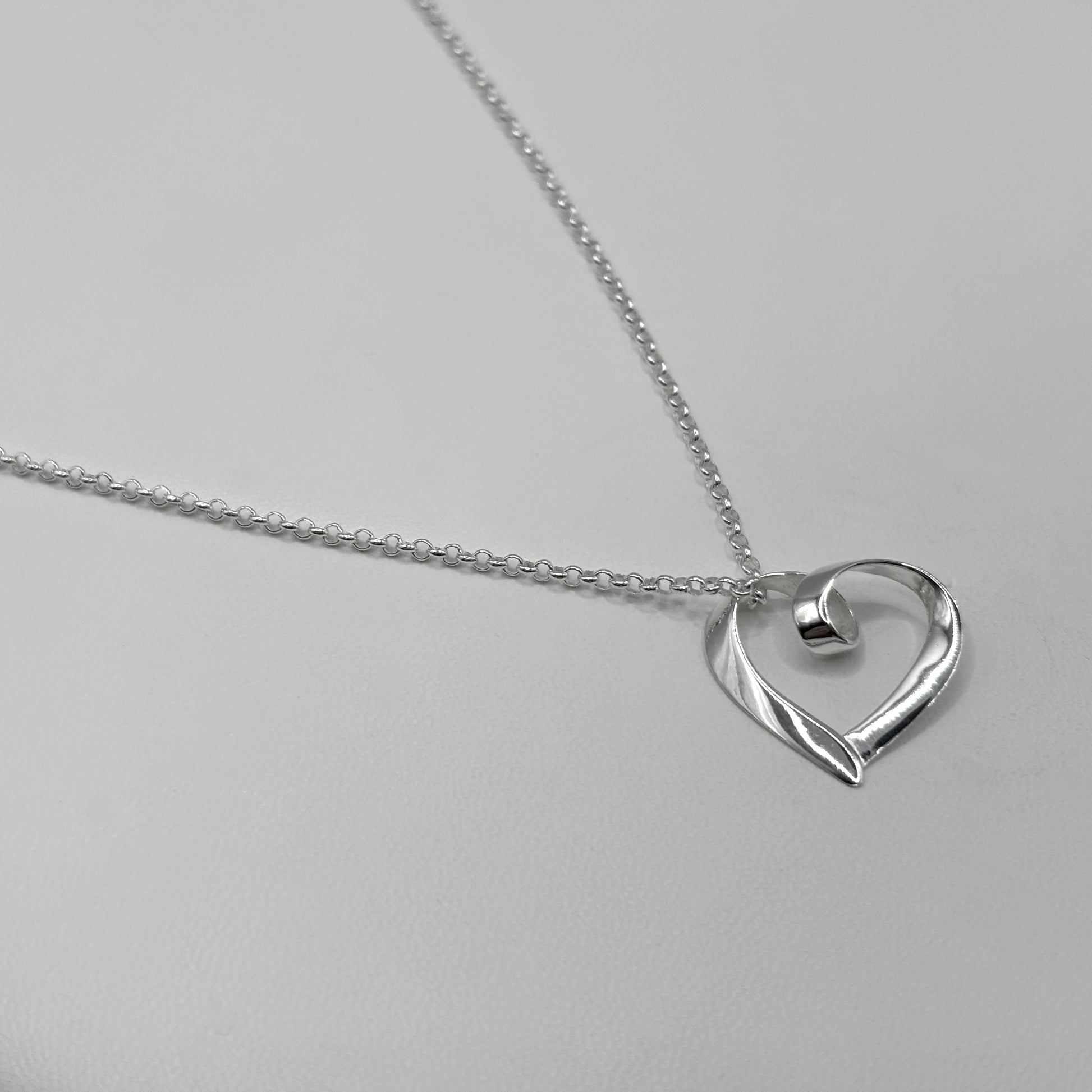 A beautiful sterling silver heart shaped pendant that flows like a ribbon, this is the medium version which has been accompanied with a fine classic necklace.