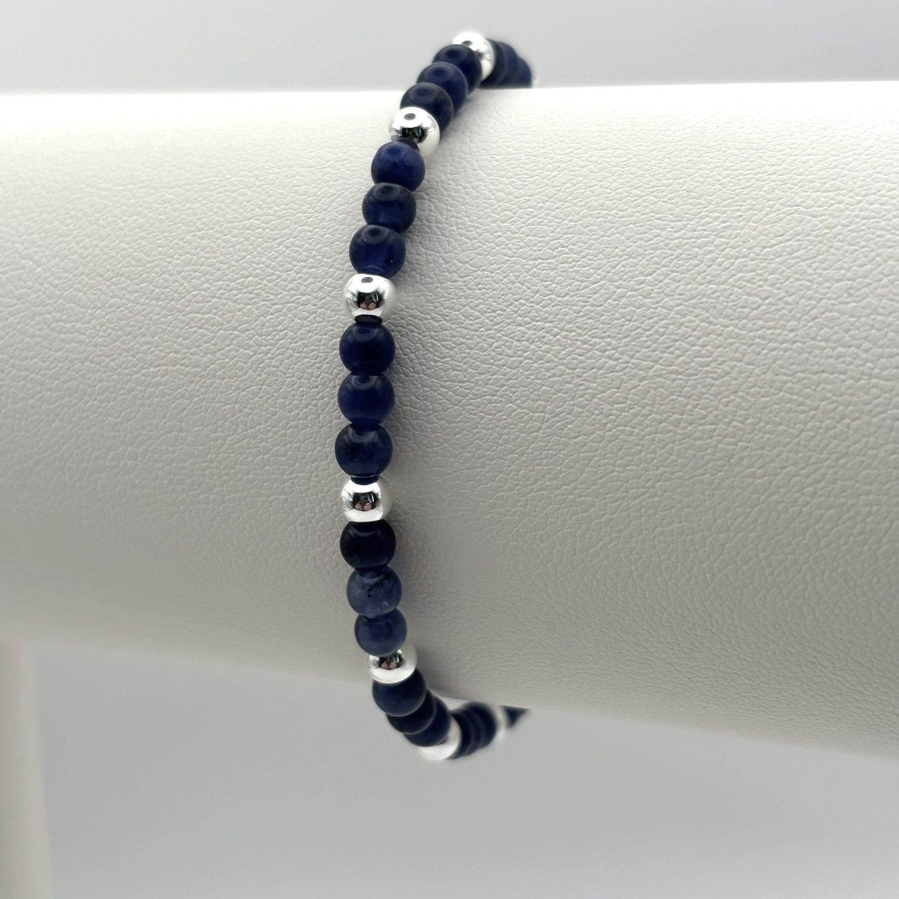 Made from 4mm sterling silver beads and dark blue sodalite beads, that can be rolled on and off of the wrist.
