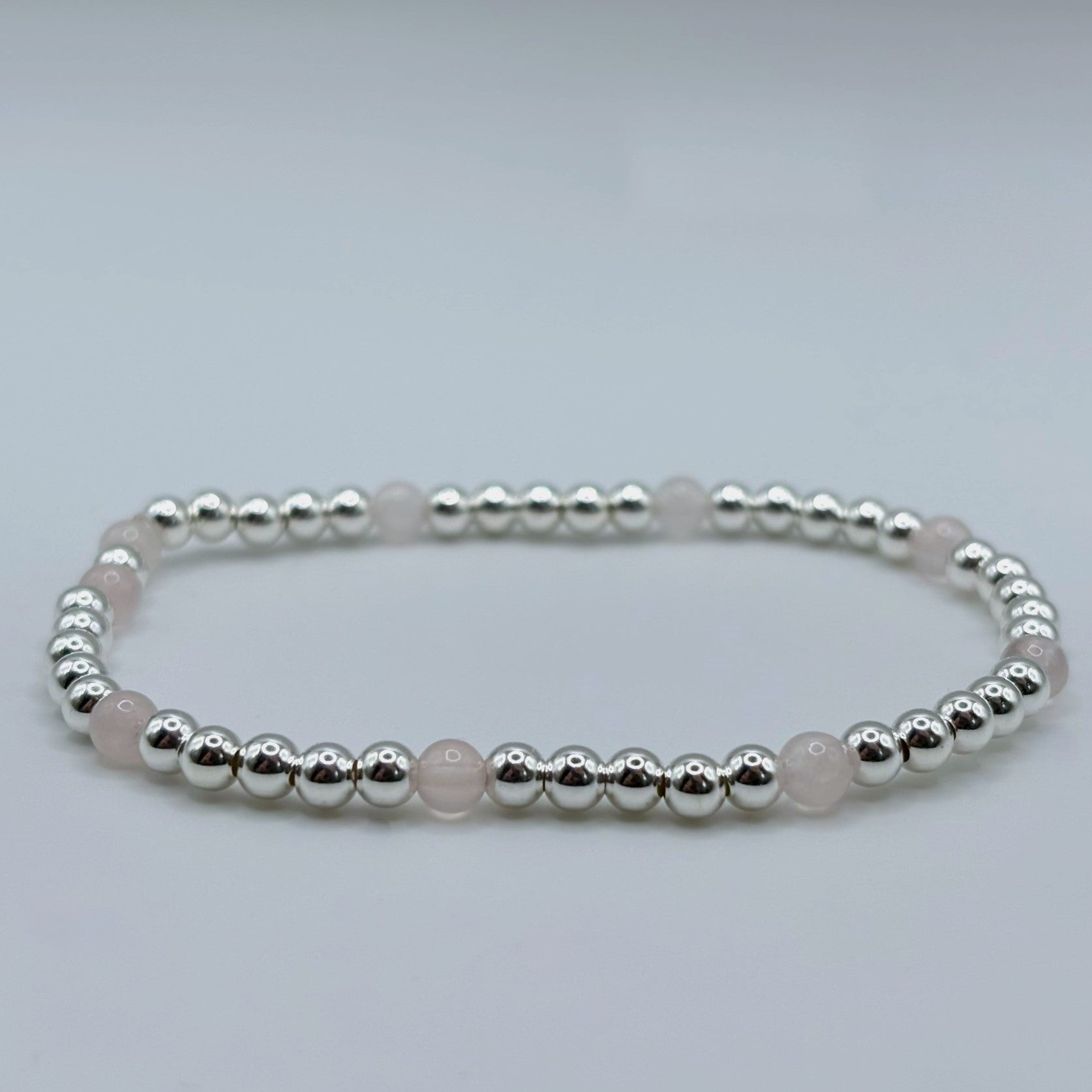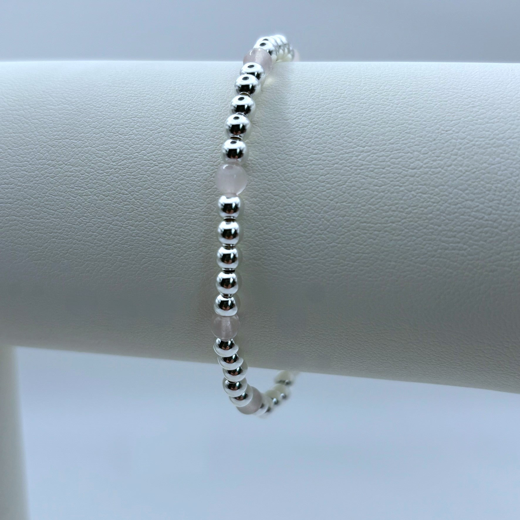 Made from 4mm sterling silver beads and 5mm rose quartz beads, that can be easily rolled on and off of the wrist.