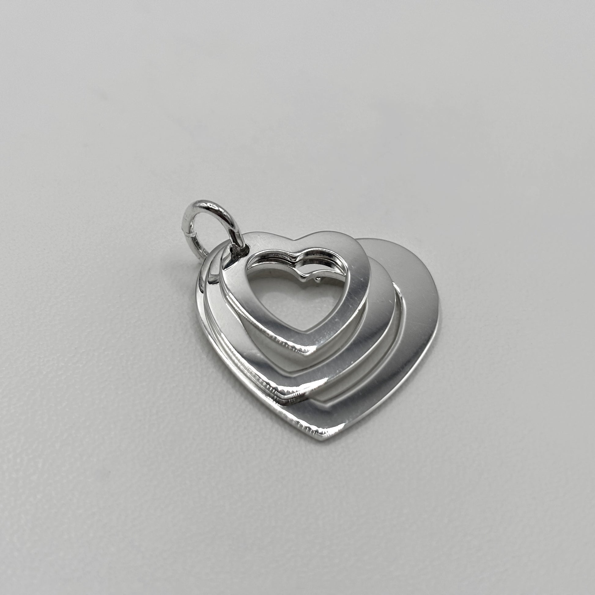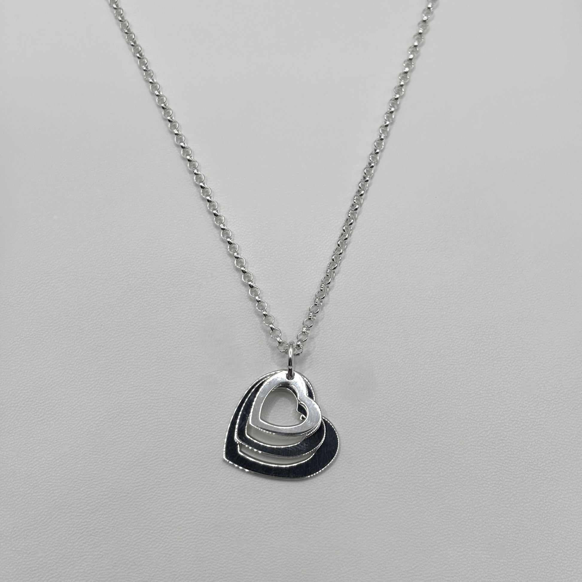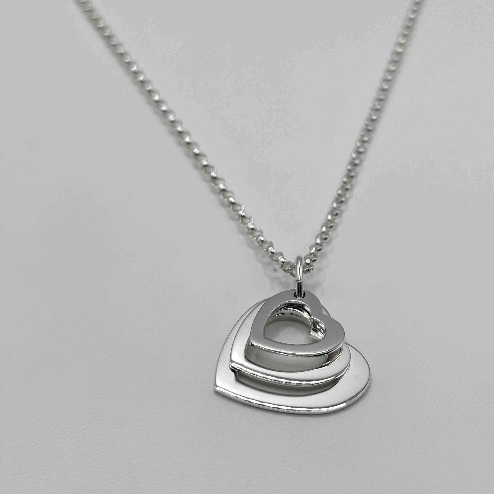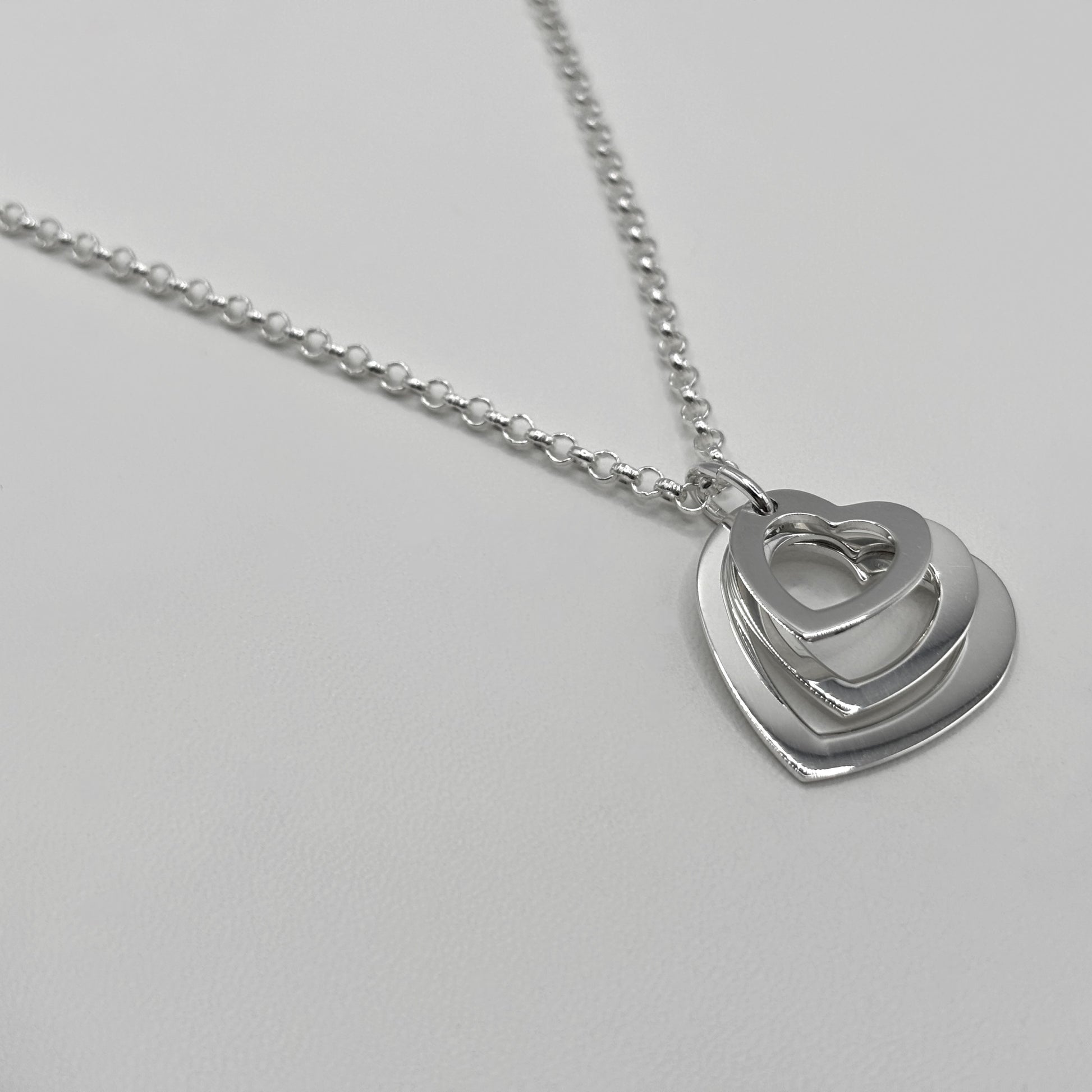 This beautiful pendant has three different size hearts that lay flat held together with an oval link on a classic necklace chain.