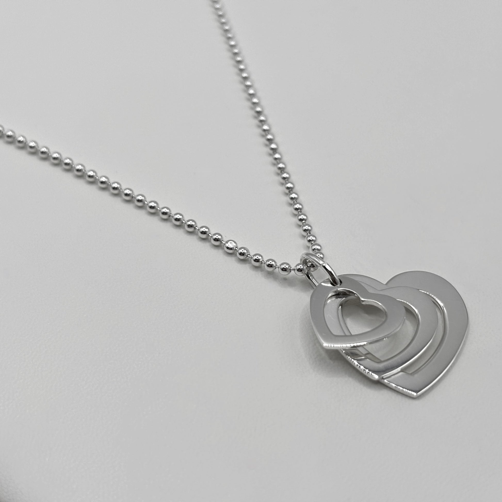 What is better than one heart? Three! This beautiful sterling silver pendant has three different size hearts that lay flat and held together with an oval link on a bead necklace. It's a stunning piece of jewellery that really compliments the neckline.