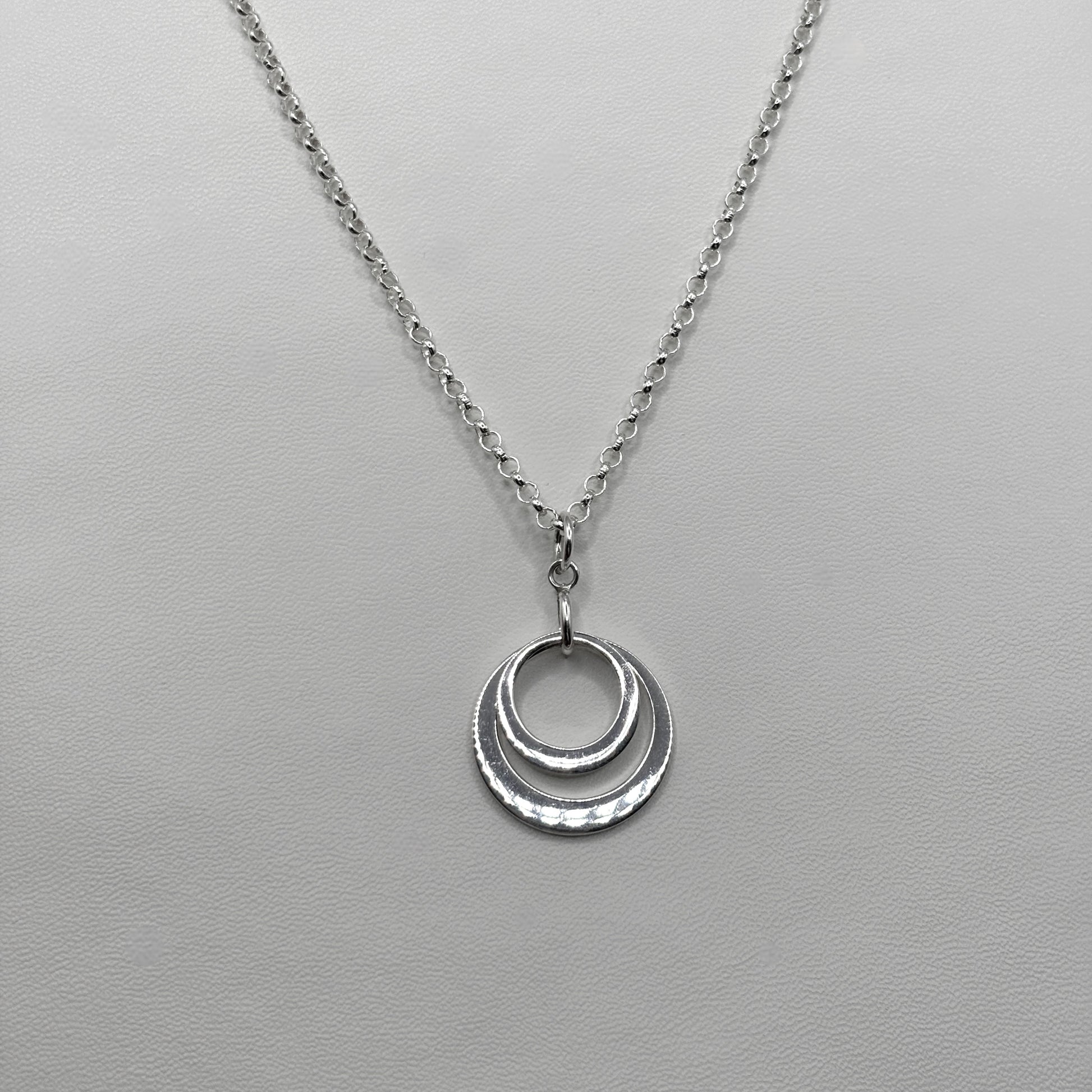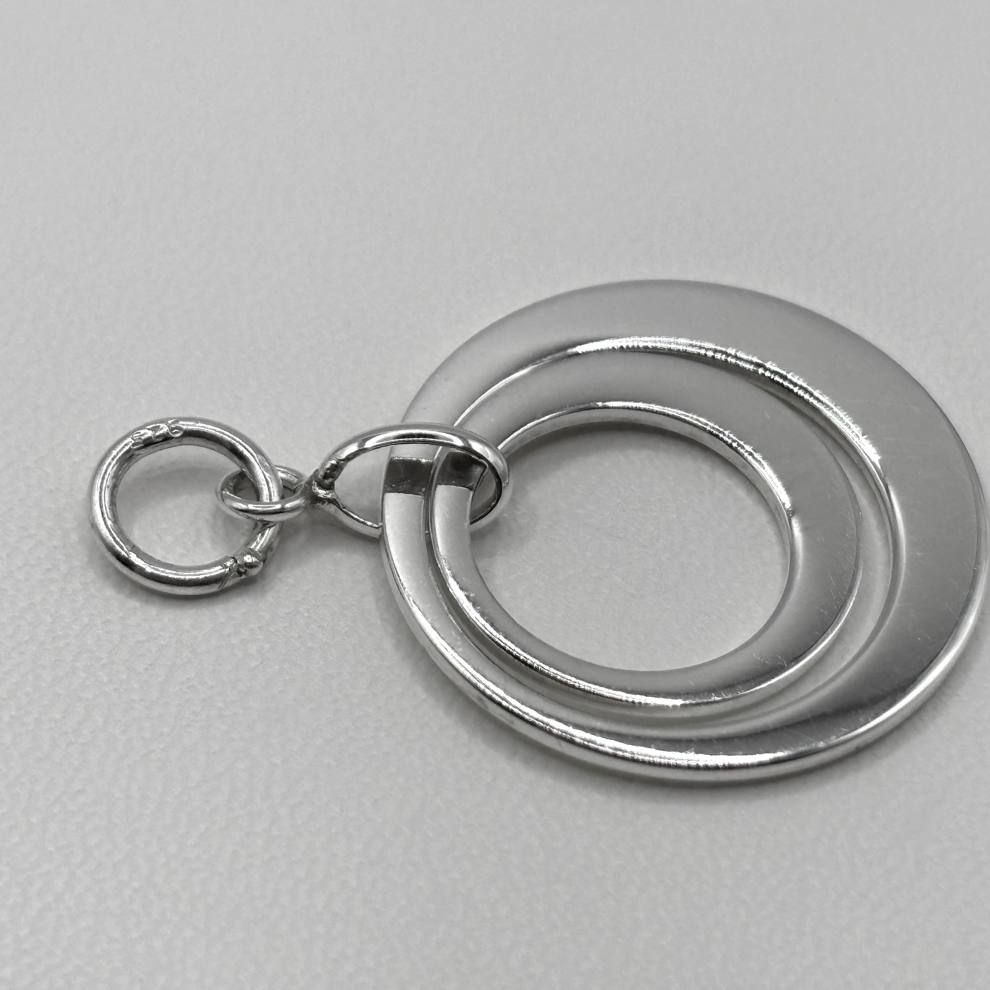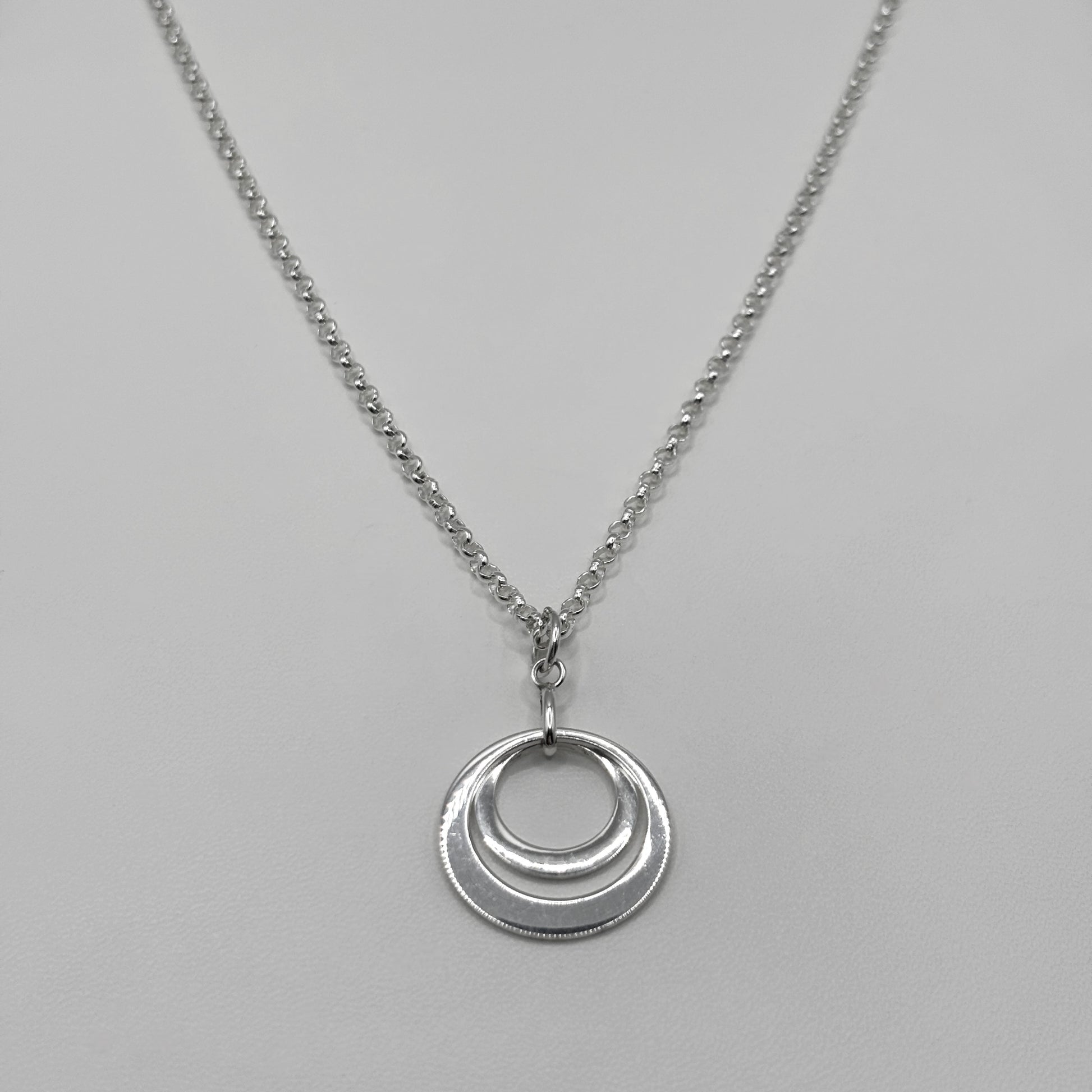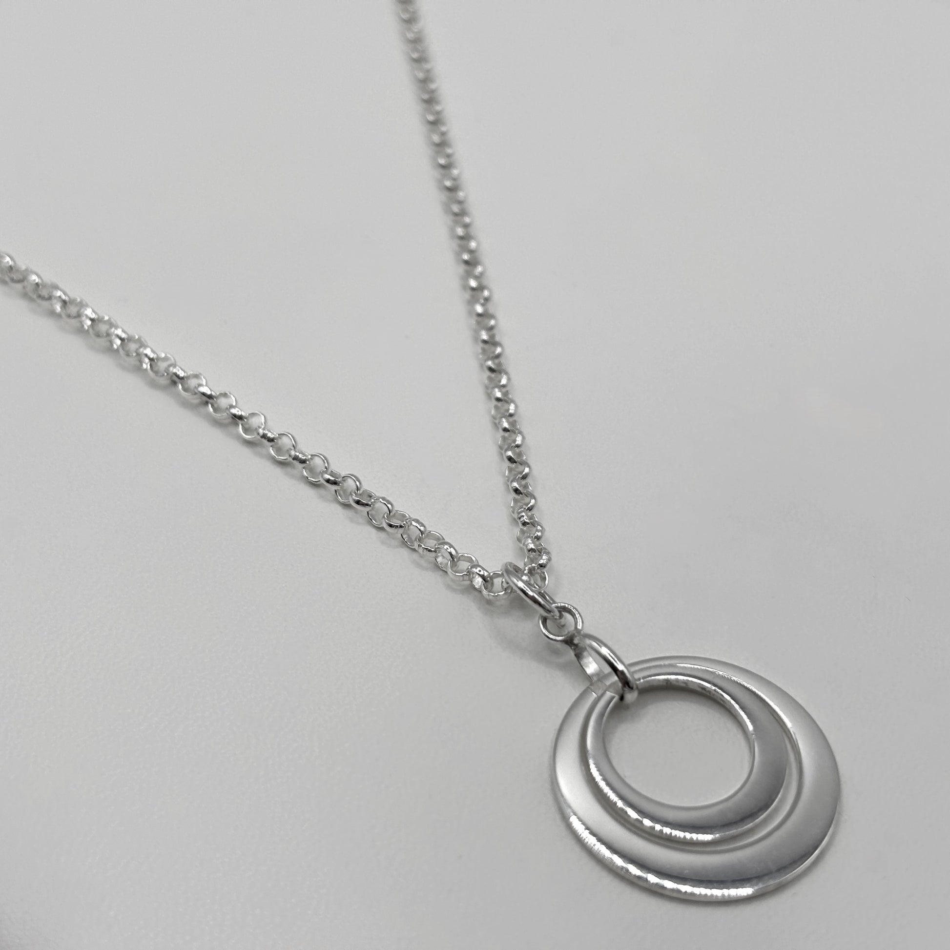 A stylish sterling silver pendant of a small ring hanging snugly inside a larger disc and complimented by a classic necklace chain.