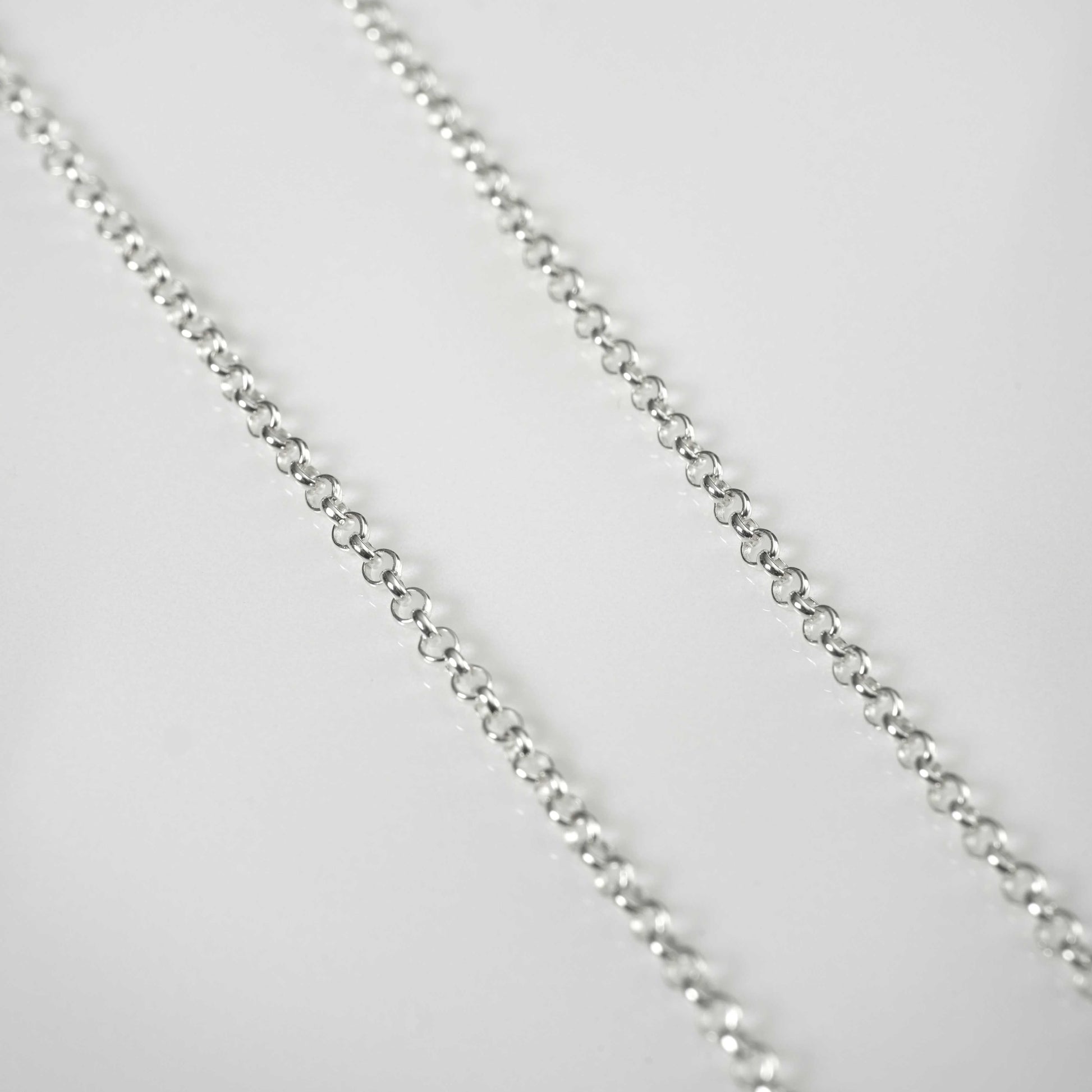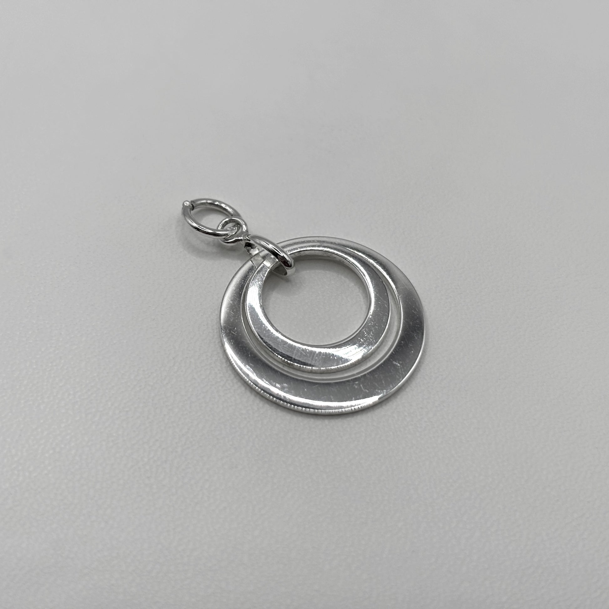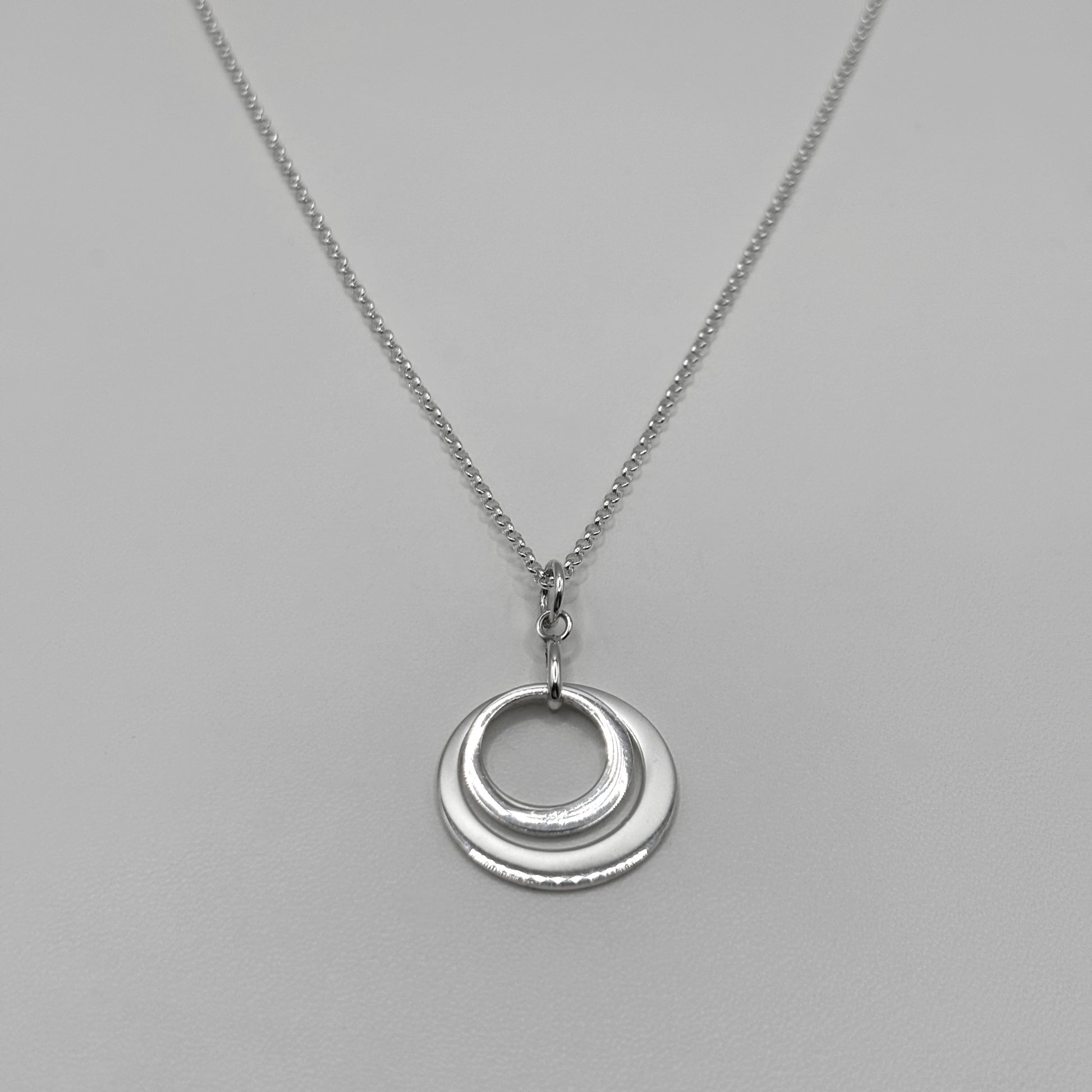 A stylish sterling silver pendant that hangs quite separately from the chain with a small ring disc hanging inside a larger one on a fine classic chain necklace.
